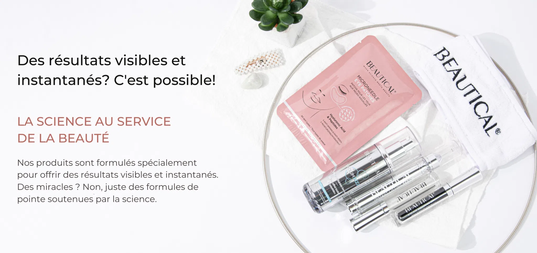 Issus d’une véritable passion pour les cosmétiques et du désir d’atteindre une efficacité extrême, nos produits associent une technologie innovante et des ingrédients puissants. Nous croyons au pouvoir du plaisir de se voir plus belle. BEAUTICAL souhaite créer un cercle vertueux qui fera de sa gamme de soins un allié essentiel dans votre vie quotidienne.